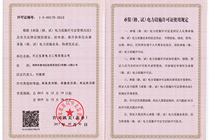公司資質(zhì)證件齊全。目前擁有電力工程施工總承包叁級(jí)資質(zhì)、四級(jí)承裝(修、試)電力設(shè)施許可證。